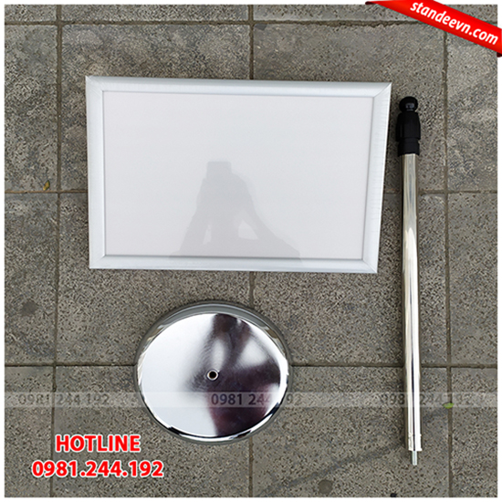 Giá để menu đứng này có cấu tạo gồm 3 phần chính: chân đế, thân và khung thông tin inox