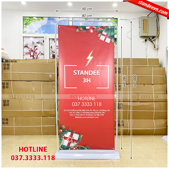 - Standee khung cửa đế sắt tiêu chuẩn: có cấu tạo mỏng nhẹ (1.3-1.5kg) thích hợp trưng bày trong nhà (không chịu được gió ngoài trời), túi đóng gói cho loại tiêu chuẩn có màu đen.