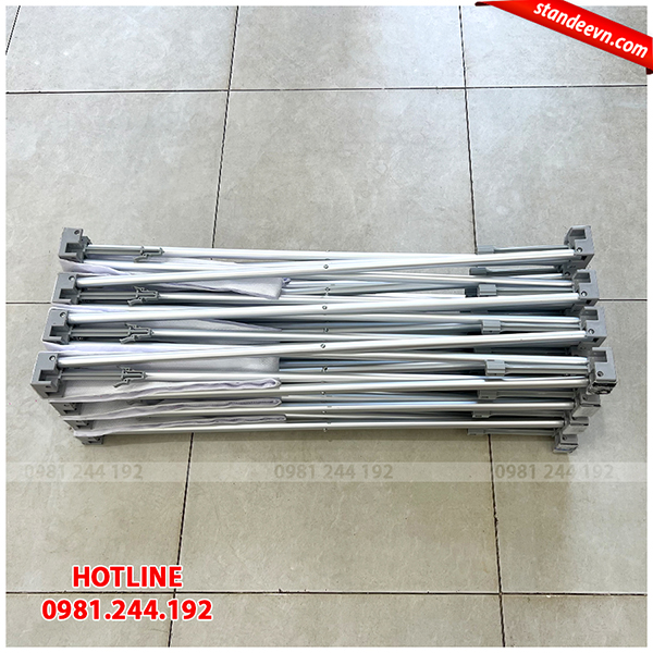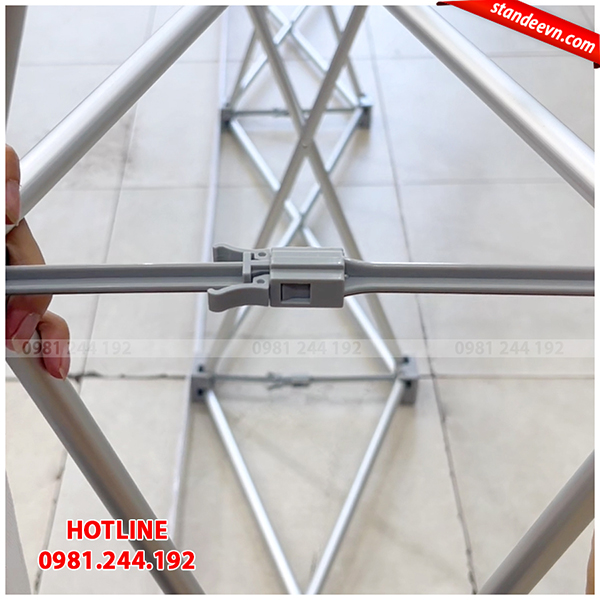 Khung được làm bằng hợp kim nhôm cao cấp, sử dụng các khớp nối nhựa để gấp xếp và băng dính móc để gắn các tấm poster, thuận tiện cho quá trình lắp ráp và sử dụng.